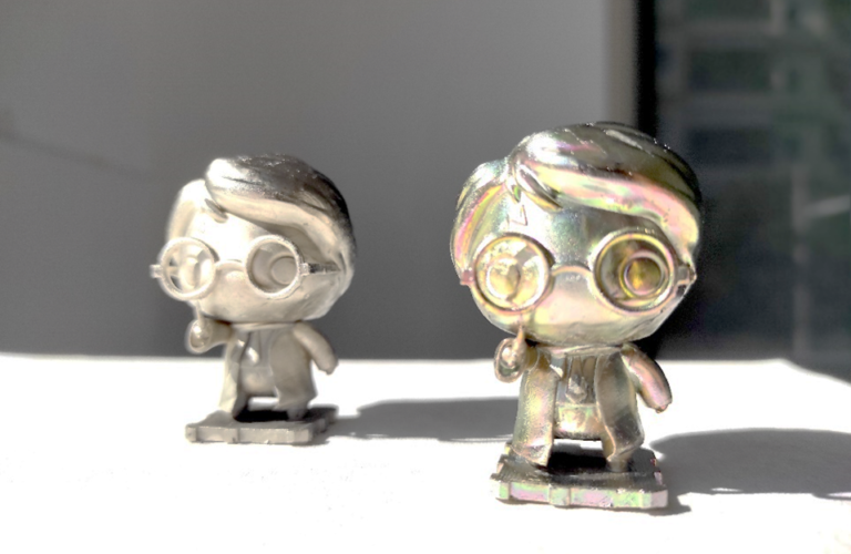 Finally, our Palladium and Chromium free electroless plating 3DPlate technology can be applied to even more complicated 3D printed objects, such as miniatures of fictional characters! In Creative Nano, we can produce metal coatings on 3D printed models of the fan-favorite wizard Harry Potter. The final coatings, as depicted below, are Shiny Nickel (left) and Cold Galvanizing (right).