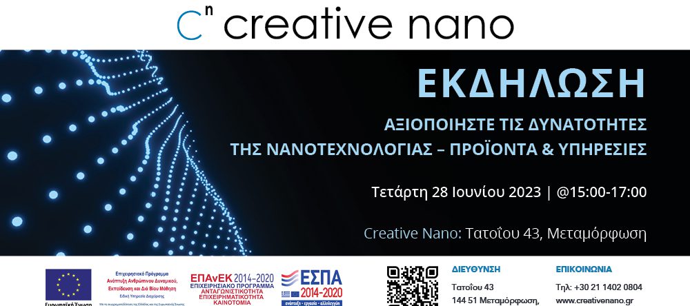 Με επιτυχία πραγματοποιήθηκε η υβριδική εκδήλωση: "Αξιοποιήστε τις δυνατότητες της νανοτεχνολογίας – Προϊόντα & Υπηρεσίες" από την Creative Nano τη Τετάρτη 28 Ιουνίου. Το κατάλληλα καταρτισμένο προσωπικό της εταιρείας πραγματοποίησε ομιλίες σχετικές με τις εξής υπηρεσίες και προϊόντα νανοτεχνολογίας που παρέχει η Creative Nano: 1) Προηγμένες Μέθοδοι Χαρακτηρισμού Υλικών 2) […]